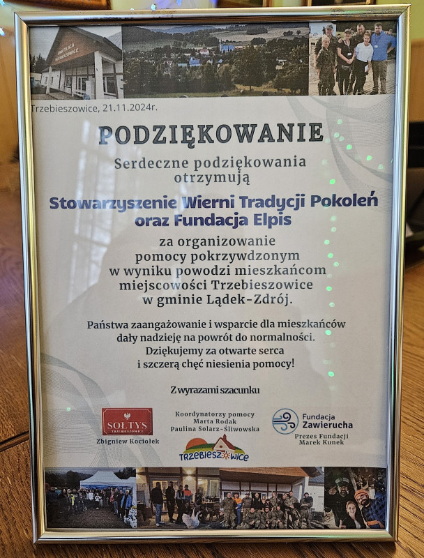 Na ręce tych wszystkich, którzy nie pozostali obojętni i właczyli się w niesienie pomocy na rzecz powodzian w 2024 roku, Zarząd Fundacji ELPIS przekazuje serdeczne wyrazy uznania i otrzymane PODZIĘKOWANIE.