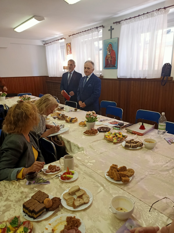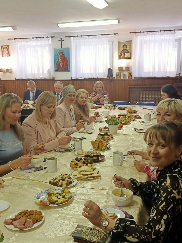 W godzinach popołudniowych, dzięki ogromnej otwartości i przychylności pani Olgi Charkiewicz – przewodniczącej, odbyło się spotkanie z licznym gronem pań z parafialnego Siestryczestwa[i]. Rozmowa rozpoczęła się w iście domowych warunkach, po chrześcijańsku i z tradycją - wspólną modlitwą i wspólnym posiłkiem. Warunki były wyjątkowe a i okazja szczególna do nawiązania bezpośrednich relacji, przekazania najistotniejszych informacji nt. tworzonego Charytatywnego Centrum Opieki i Pomocy oraz podejmowanych działań na rzecz osób z niepełnosprawnościami, starszych, chorych i samotnych.