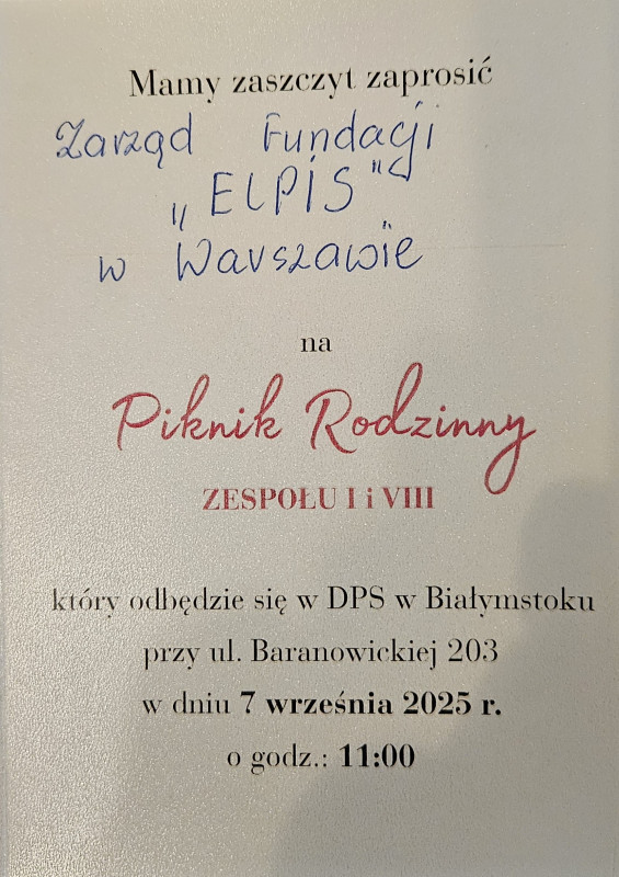 Zarząd Fundacji Elpis pragnie bardzo serdecznie podziękować Dyrekcji i Zespołowi I za zaproszenie na Piknik Rodzinny Zespołu I i VIII, który odbędzie się w Domu Pomocy Społecznej w Białymstoku* przy ul. Baranowickiej 203 w dniu 7 września 2025 roku o godz. 11.00.